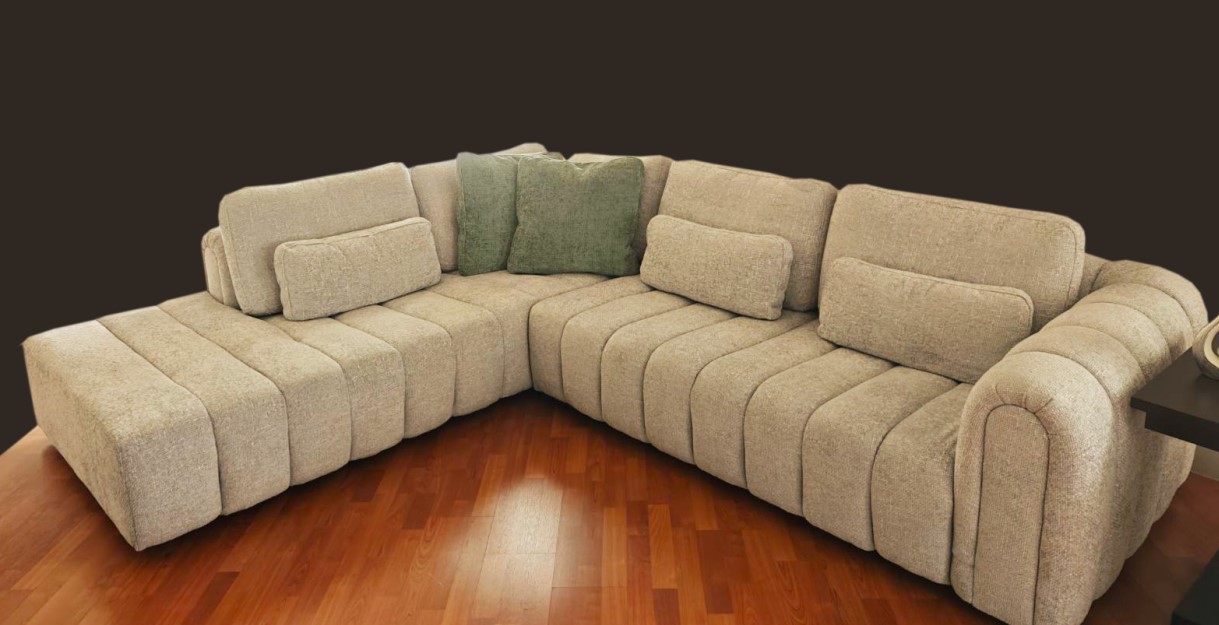 Ένας γωνιακό σαλόνι με το όνομα MADEIRA με ύφασμα αδιάβροχο αλέκιαστο σε γήινους χρωματισμούς μπεζ αξίας 2500 ευρώ.